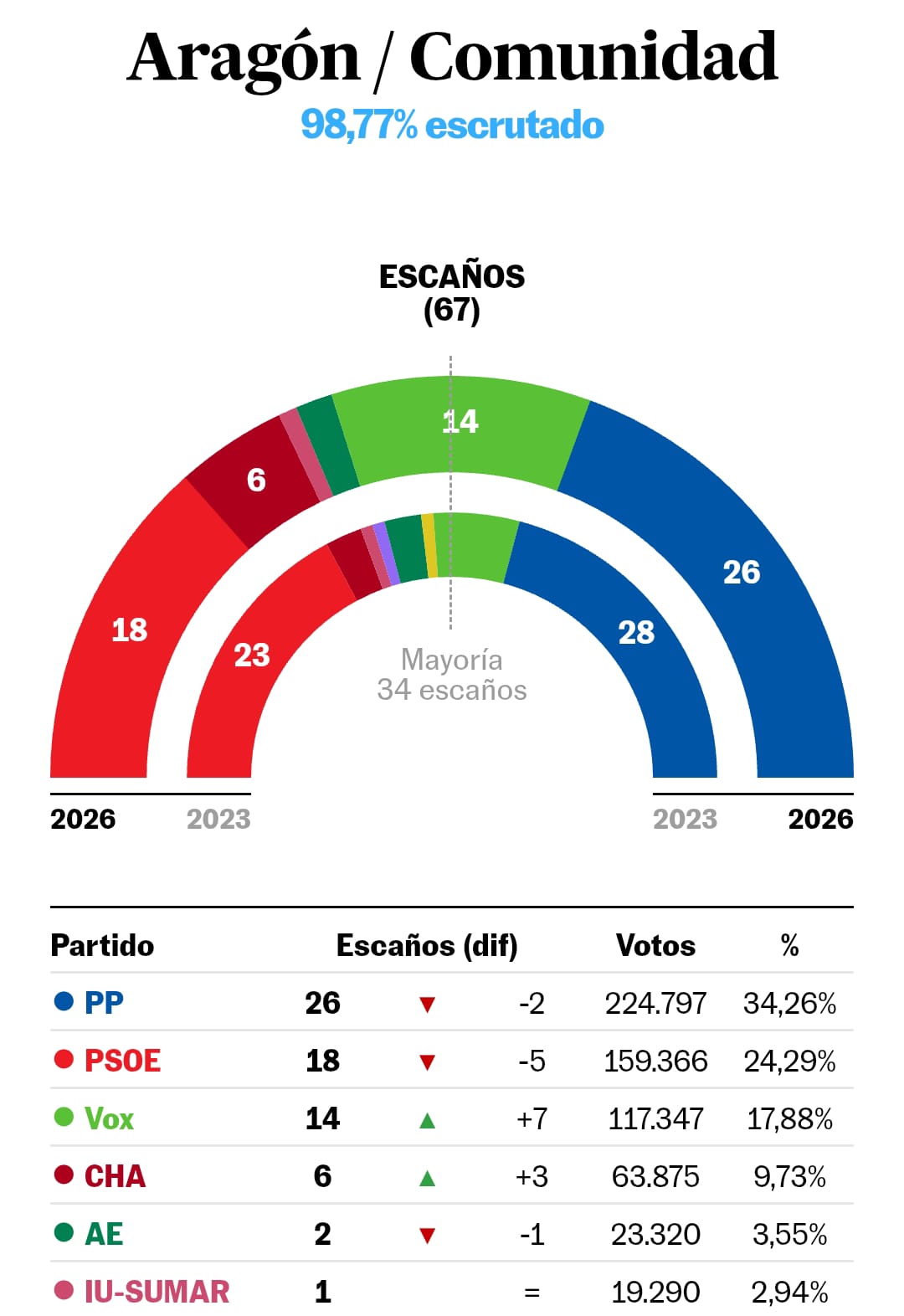 السكرتيرة العامة للحزب الاشتراكي في أراغون، بيلار أليغريا، دعت إلى التريث وإجراء «قراءة متأنية» للنتائج، بعد أن تراجع حزبها من 23 إلى 18 مقعدًا.